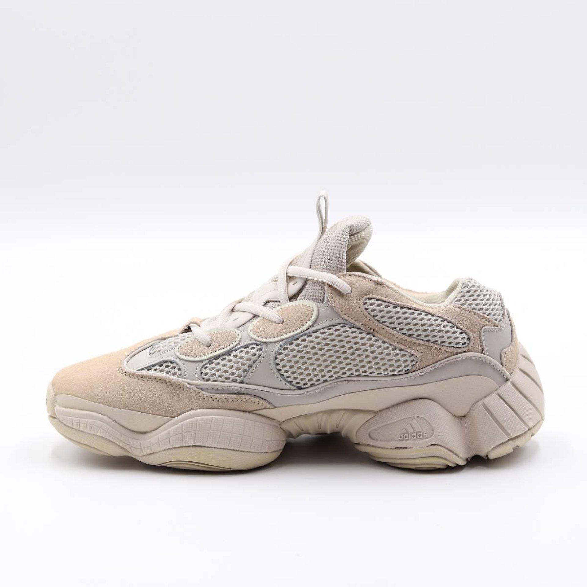 Initially released in February 2018 as a limited pre-order in New York and Los Angeles, the Yeezy 500 ‘Blush’ underwent a general release in April 2018. Its moniker is a fitting one, as the monochromatic light taupe finish barely registers as a color. The subdued palette is contrasted by a bold silhouette, featuring a paneled mesh and suede upper combined with a hefty midsole reminiscent of adidas’ Feet You Wear' technology of the 1990s.